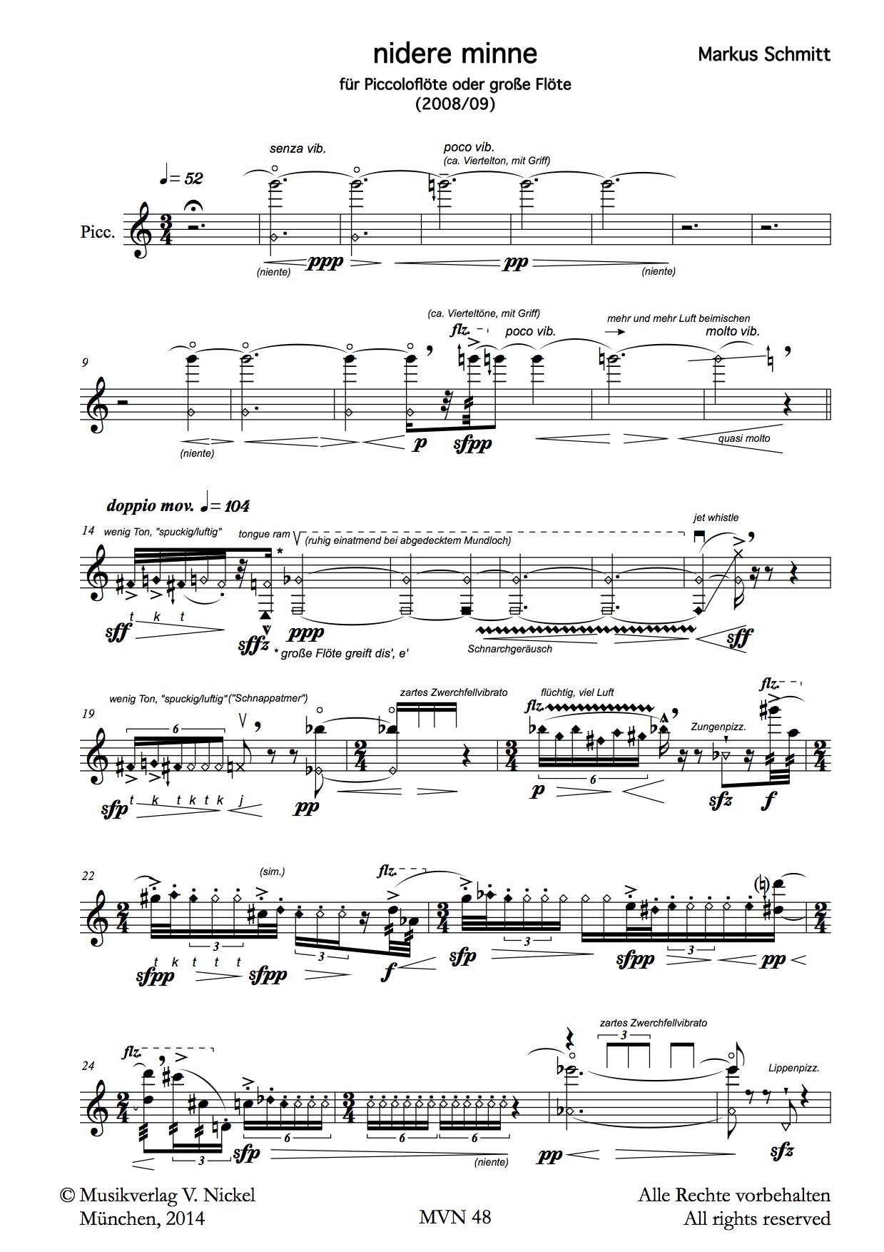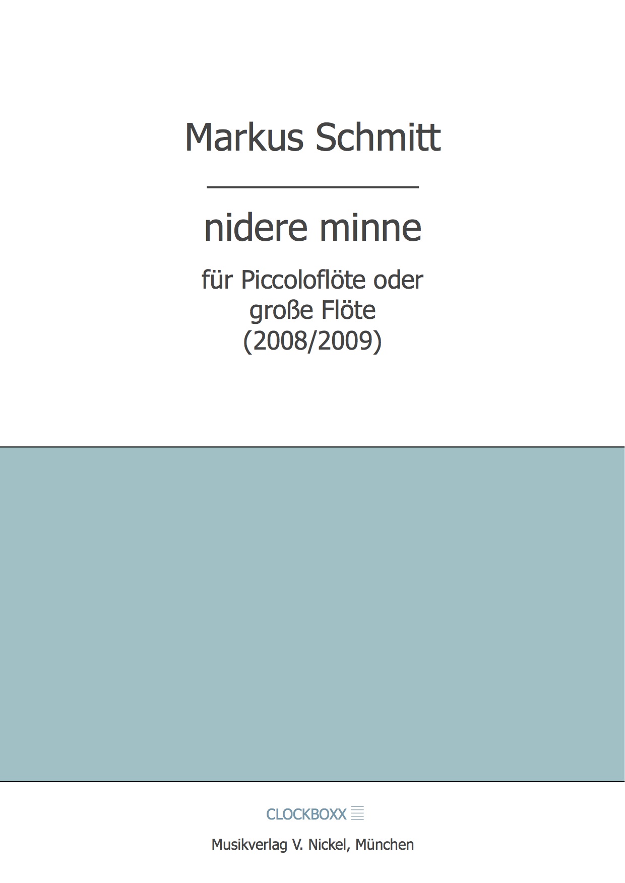 nidere minne ist eine augenzwinkernde Reverenz an das spätmittelalterliche Tagelied, mit frühmorgendlichen Naturlauten, ersten Sonnenstrahlen, erwachendem Vogelgezwitscher und einer von hektischer Eile getriebenen Morgengymnastik in verzwickten Metren. Das Stück wurde 1998 für das Ensemble plein air geschrieben, die vorliegende Solo-Version für Piccoloflöte entstand 2008/09, angeregt durch die virtuose Vielseitigkeit des Flötisten Daniel Agi.
