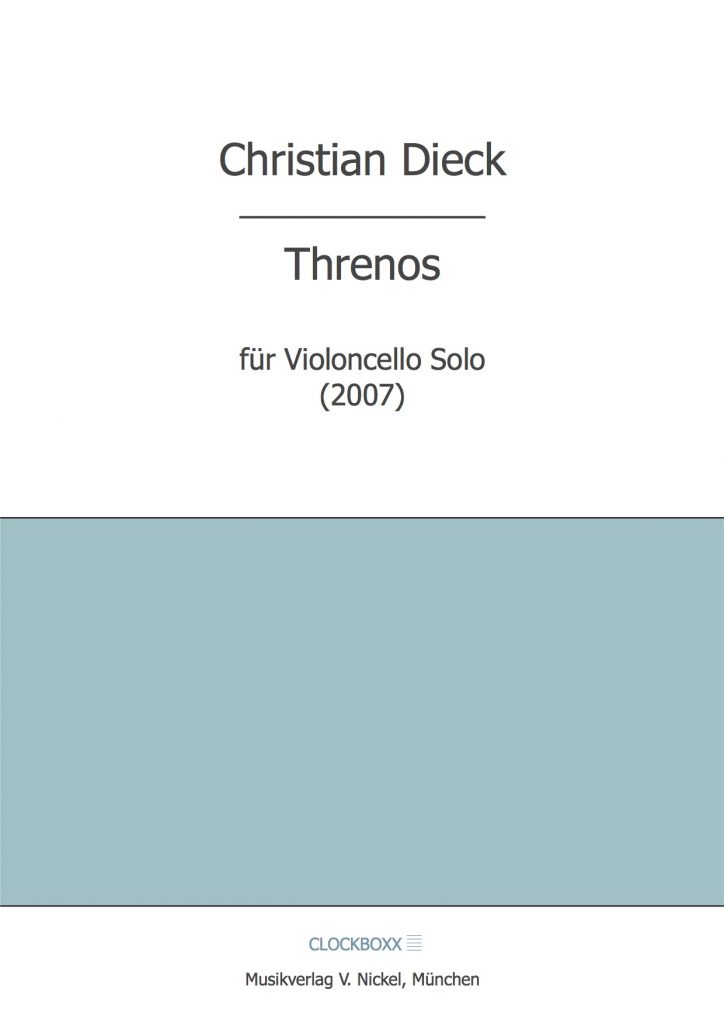 Threnos für Violoncello Solo entstand Ende 2007 und wurde von der Cellistin Mareike Kirchner in München uraufgeführt. Zentrales Thema der Komposition ist das miteinander Verschmelzen von Nähe und Distanz. Kleinste Partikel lösen wie Initialen eine Entwicklung von Motiven und Linien aus, die mit anderen korrespondieren und sich immer wieder annähern und entfernen.