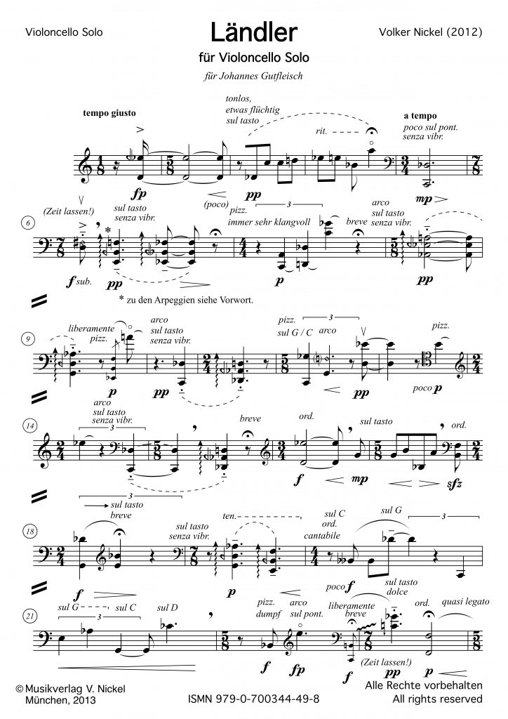 Ländler für Violoncello Solo entstand 2012 für Johannes Gutfleisch. In dem Stück sind aus einem längeren cantus firmus unterschiedliche musikalische Figuren abgeleitet, deren unregelmäßiges Auftauchen die Oberfläche der Komposition bildet. Wie die Figuren im Innern verbunden sind, entzieht sich dem Blick – der cantus firmus selbst wird nie allein oder im ganzen vorgetragen; was mit den Figuren geschieht, wenn sie gleichsam abwesend sind, das weiß man nicht. Das alles gleicht der Perspektive, die jemand hat, der vor einem großen Aquarium steht und auf das Wiedererscheinen eines bestimmten Fisches wartet. Eine musikalische Figur, die ich ihrer Harmonik und Melodik, ihres Zögerns und Abwartens und Anhebens wegen „Ländler“ genannt und im Notentext auch so gekennzeichnet habe, gibt dem Stück seinen Namen. Der Ländler kehrt wieder wie Tierspuren, die einen Weg kreuzen. Es ist wie das Lauschen auf eine von fern her klingende Musik, die der Wind nur dann und wann an die Ohren trägt. Man könnte das die Diskontinuität des Erlebens nennen. Es bleiben Lücken. – Und es bleibt die Frage, was jenseits des Wahrgenommenen geschieht, ob die Dinge zu einer sinnvollen Einheit und Handlung verbunden sind, und worauf ihre Eigenschaften verweisen? Haben alle Dinge mit der selben Eigenschaft einen gemeinsamen Ursprung? Das wäre – auch in der Musik – eine Frage nach der Beseeltheit der Dinge, nach ihrem inneren Sinn und vielleicht nach ihrer Ewigkeit.